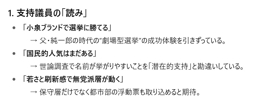 それに、小泉ブランドや国民的人気があると思っていること自体、一般の国民感覚とはちょっとズレているようにも感じますが・・・・