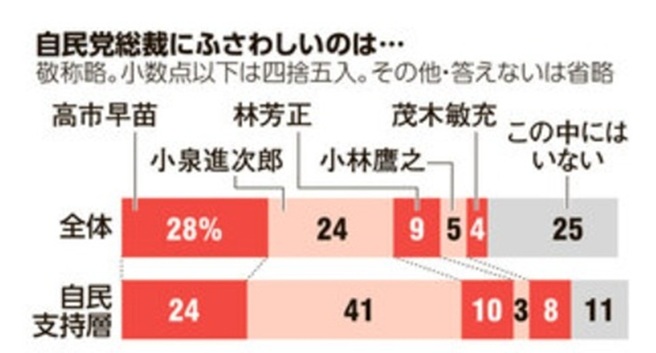そのひとつに、9月21日、朝日新聞による、「新しい自民党総裁に誰がふさわしいと思うか」という全国世論調査(電話)があります。