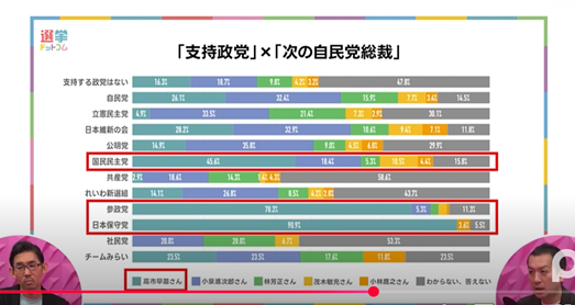 その中で、このグラフは、「各政党の支持者が次の総理として誰を希望しているか」を表しているものです。