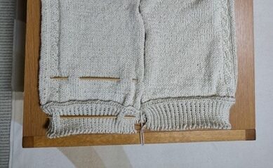 そして、当初の予定では、身頃のメリヤス編みと裾のゴム編みの間に下の画像のように模様編みを入れていたのですが、実際に編んでみるとなんかもっさりしてイマイチだったので、しないことにしました。