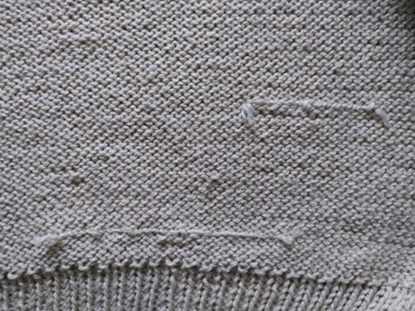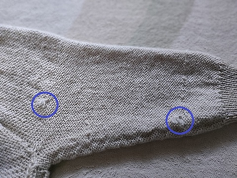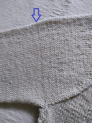 これ、この境目のところは編み目を休ませて先に身頃を裾まで編み進め、身頃を編み終えたら休ませていた目を拾って袖を編んでいくのですが、その時にそれまでの編み加減よりきつめに編んでしまったようなんです。