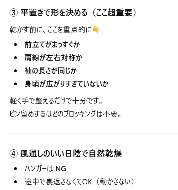 平置きでなく、ハンガーがけや、物干し竿にかけて干すのなら楽なのですが、それだと編地が伸びてしまうのでNG