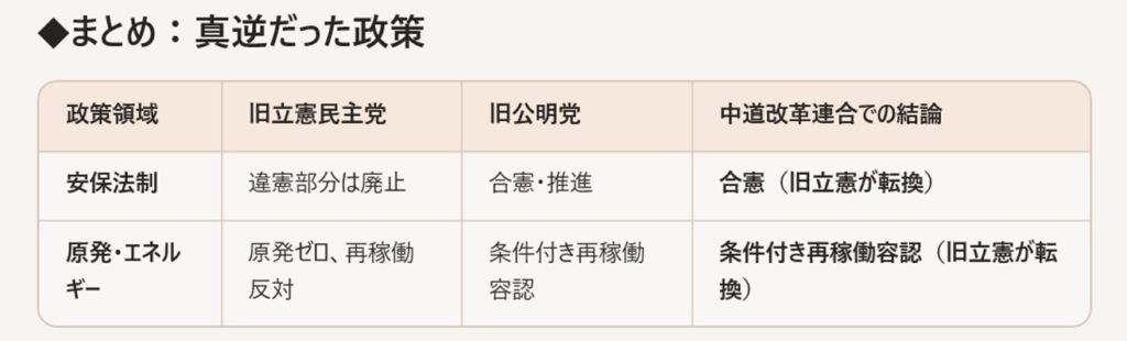どちらの政策も、旧立憲がそれまで言っていた内容を変えて、旧公明党に歩み寄った形になっています。
