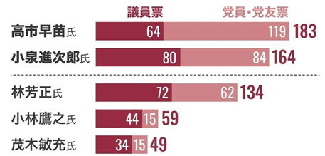 そして、合計は高市さん183票、小泉さん164票と、高市さんが1位通過!