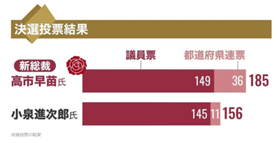一方の高市さんは、党員票は予想通り圧倒的多数であるものの、議員票は40票台と言われていましたが、蓋を開けてみると、64票。
