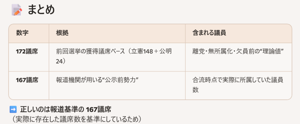 ちなみに、私は中道のこれまでの議席数は立憲148+公明24=172議席だと思っていたのですが、上の読売新聞オンラインでは167議席となっているので、Copilotに聞いてみました。